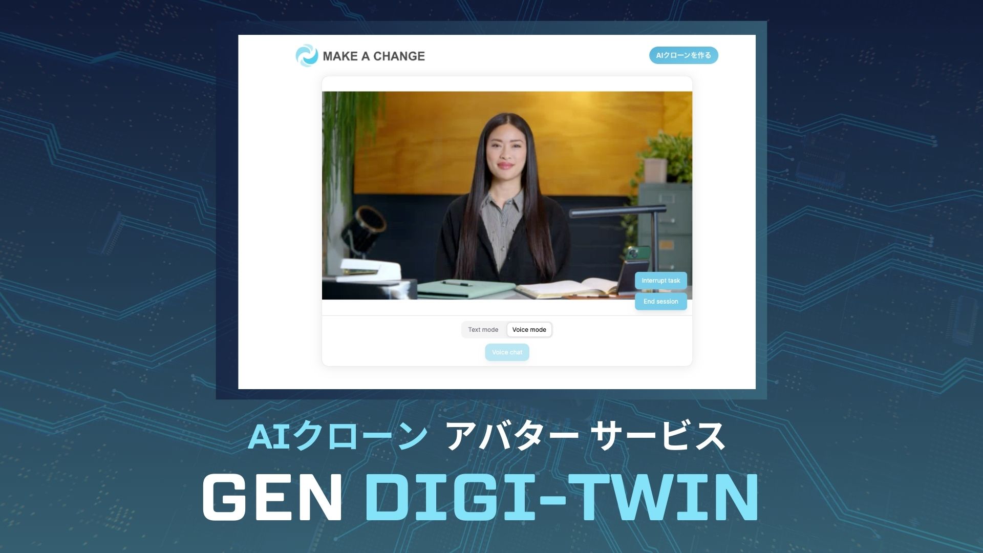 2025年3月3日 株式会社MAKE A CHANGE(本社:東京都千代田区、代表取締役社長:岡村匡洋)は、個人の見た目と音声をAIでクローン化し、様々な役割を与えて活用できるサービス「Gen DigiTwin(ジェン・デジツイン)」を開始しました。